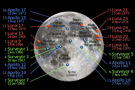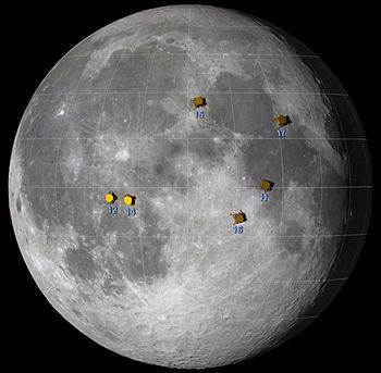 Clickable imagemap of the locations of all successful soft landings on the Moon to date. Dates are landing dates in UTC.