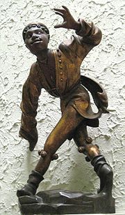 A small statue of a "Moriskentänzer" made by Erasmus Grasser in 1480, one of a set of 16, of which only 10 remain. This dancer is clearly " moorish", but all the other 9 surviving carvings have caucasian features. All wear bells on their legs.