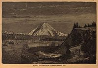 Although "Rainier" had been considered the official name of the mountain, Theodore Winthrop, in his posthumously published 1862 travel book The Canoe and the Saddle, referred to the mountain as "Tacoma" and for a time, both names were used interchangeably, although "Mt. Tacoma" was preferred in the city of Tacoma.