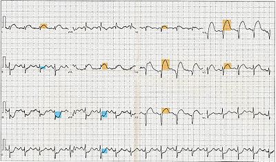 12-lead electrocardiogram showing ST-segment elevation (orange) in I, aVL and V1-V5 with reciprocal changes (blue) in the inferior leads, indicative of an anterior wall myocardial infarction.