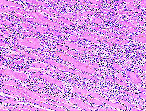 Microscopy image (magn. ca 100x, H&E stain) from autopsy specimen of myocardial infarct (7 days post-infarction).
