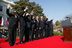| “ | The Parties may by unanimous agreement, invite any other European State in a position to further the principles of this Treaty and to contribute to the security of the North Atlantic area to accede to this Treaty. Any State so invited may become a Party to the Treaty by depositing its instrument of accession with the Government of the United States of America. The Government of the United States of America will inform each of the Parties of the deposit of each such instrument of accession. | ” |