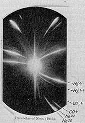 Neon played a role in the basic understanding of the nature of atoms in 1913, when J. J. Thomson, as part of his exploration into the composition of canal rays, channeled streams of neon ions through a magnetic and an electric field and measured their deflection by placing a photographic plate in their path. Thomson observed two separate patches of light on the photographic plate (see image), which suggested two different parabolas of deflection. Thomson eventually concluded that some of the atoms in the neon gas were of higher mass than the rest. Though not understood at the time by Thomson, this was the first discovery of isotopes of stable atoms. It was made by using a crude version of an instrument we now term as a mass spectrometer.