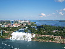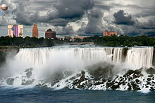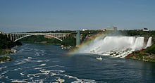 Niagara Falls ( Cayuga: Gahnawehtaˀ or Tgahnawęhtaˀ) is the collective name for three waterfalls that straddle the international border between the Canadian province of Ontario and the U.S. state of New York. They form the southern end of the Niagara Gorge.