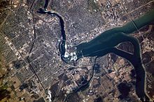 Located on the Niagara River, which drains Lake Erie into Lake Ontario, the combined falls form the highest flow rate of any waterfall in the world, with a vertical drop of more than 165 feet (50 m). Horseshoe Falls is the most powerful waterfall in North America, as measured by vertical height and also by flow rate. The falls are located 17 miles (27 km) north-northwest of Buffalo, New York and 75 miles (121 km) south-southeast of Toronto, between the twin cities of Niagara Falls, Ontario, and Niagara Falls, New York.