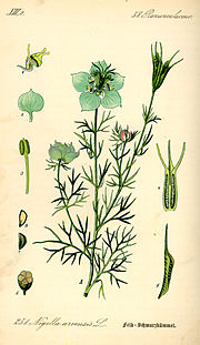 Nigella is a genus of about 14 species of annual plants in the family Ranunculaceae, native to southern Europe, north Africa and southwest Asia. Common names applied to members of this genus are Devil-in-a-bush or Love in the mist.