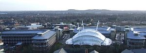 Nottingham Playhouse and Cathedral reflected in Anish Kapoor's Sky Mirror