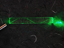 Fiber optics, though used extensively in the modern world, is a fairly simple, and relatively old, technology. Guiding of light by refraction, the principle that makes fibre optics possible, was first demonstrated by Daniel Colladon and Jacques Babinet in Paris in the early 1840s. John Tyndall included a demonstration of it in his public lectures in London, 12 years later. Tyndall also wrote about the property of total internal reflection in an introductory book about the nature of light in 1870: "When the light passes from air into water, the refracted ray is bent towards the perpendicular... When the ray passes from water to air it is bent from the perpendicular... If the angle which the ray in water encloses with the perpendicular to the surface be greater than 48 degrees, the ray will not quit the water at all: it will be totally reflected at the surface.... The angle which marks the limit where total reflection begins is called the limiting angle of the medium. For water this angle is 48°27', for flint glass it is 38°41', while for diamond it is 23°42'." Unpigmented human hairs have also been shown to act as an optical fibre.