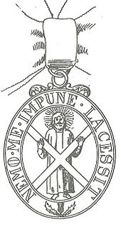 • At the right hip of the Riband, the badge of the Order is attached. The badge depicts St Andrew in the same form as the badge-appendant surrounded by the Order's motto.