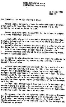 According to a CIA analysis dated 22 December 1988, several groups were quick to claim responsibility in telephone calls in the United States and Europe: