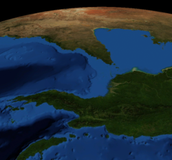 Geologically, the island of New Guinea is a northern extension of the Indo-Australian tectonic plate, forming part of a single land mass which is Australia-New Guinea (also called Sahul or Meganesia). It is connected to the Australian segment by a shallow continental shelf across the Torres Strait, which in former ages had lain exposed as a land bridge, particularly during ice ages when sea levels were lower than at present.