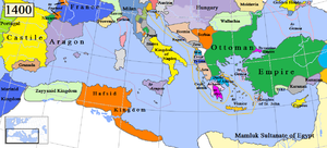 A historical map of the Mediterranean states in 1400. The Western Schism lasted from 1378 to 1417.