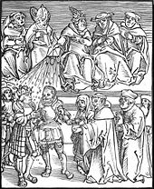 Antichristus, a woodcut by Lucas Cranach of the pope using the temporal power to grant authority to a generously contributing ruler