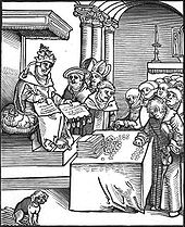 Antichristus, by Lucas Cranach the Elder, from Luther's 1521 Passionary of the Christ and Antichrist. The Pope is signing and selling indulgences.