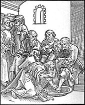 Christus, by Lucas Cranach. This woodcut of John 13:14–17 is from Passionary of the Christ and Antichrist. Cranach shows Jesus kissing Peter's foot during the footwashing. This stands in contrast to the opposing woodcut, where the Pope demands others kiss his feet.