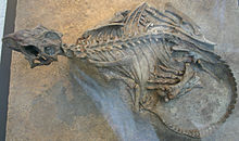 Another fossil from the Yixian Formation provides direct evidence of Psittacosaurus as a prey animal. One skeleton of Repenomamus robustus, a large triconodont mammal, is preserved with the remains of a juvenile Psittacosaurus in its abdominal cavity. Several of the juvenile's bones are still articulated, indicating that the carnivorous mammal swallowed its prey in large chunks. This specimen is notable in that it is the first known example of Mesozoic mammals preying on live dinosaurs. Heavy predation on juvenile Psittacosaurus may have resulted in R-selection, the production of more numerous offspring to counteract this loss.