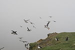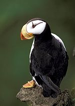 Puffin describes any of three auk species (or alcids) in the bird genus Fratercula (Latin: little brother — probably a reference to their black and white plumage, which resembles monastic robes) with a brightly colored beak in the breeding season. These are pelagic seabirds that feed primarily by diving. They breed in large colonies on coastal cliffs or offshore islands, nesting in crevices among rocks or in burrows in the soil. The Tufted Puffin was formerly placed in the genus Lunda.