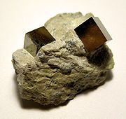 The mineral pyrite, or iron pyrite, is an iron sulfide with the formula FeS2. This mineral's metallic luster and pale-to-normal, brass-yellow hue have earned it the nickname fool's gold due to its resemblance to gold. Pyrite is the most common of the sulfide minerals. The name pyrite is derived from the Greek πυρίτης (puritēs), “of fire” or "in fire”, from πύρ (pur), “fire”. This name is likely due to the sparks that result when pyrite is struck against steel or flint. This property made pyrite popular for use in early firearms such as the wheellock.