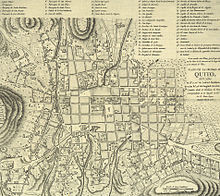 Map dated 1786, showing the city of Quito in the late 18th century. North is to the right.