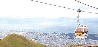 The Aerial tramway Station at Cruz Loma (part of the Pichincha mountain complex at about 4,000 metres (13,000 ft)). Since July 2005, Quito has had an aerial tramway, known as the "Telefériqo", from the city centre to the hill known as Cruz Loma on the east side of the Pichincha volcano. The ride takes visitors to an altitude of about 4,100 metres (13,500 ft). There are also trails for hiking and areas where pictures can be taken of Quito. Because of the increased altitude and the wind on the mountain, it is considerably cooler.