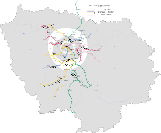 The RER (French pronunciation: [ɛʁəɛʁ]; French: Réseau Express Régional, "Regional Express Network") is a rapid transit system in France serving Paris and its suburbs. The RER is an integration of a modern city-centre underground rail and a pre-existing set of commuter rail lines. It has several connections with the Paris Métro within the city of Paris. Within the city, the RER functions like the Métro, but is faster as it has fewer stops. Since 1999 the network has consisted of five lines: A, B, C, D and E. The RER is still expanding: Line E, which opened in 1999, is planned for westward extension by 2020.