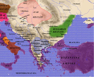 During the 580s, Byzantine literature attests to the Slavs raiding Byzantine territories in the region of Macedonia, aided by Avars or Bulgars. Historical records document that in c.680 a group of Bulgars, Slavs and Byzantines led by a Bulgar called Kuber settled in the region of Keramisian plain, centred on the city of Bitola. Presian's reign apparently coincides with the extension of Bulgarian control over the Slavic tribes in and around Macedonia. The Slavic peoples that settled in the region of Macedonia accepted Christianity as their own religion around the 9th century, during the reign of Tsar Boris I of Bulgaria.