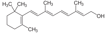 Many different geometric isomers of retinol, retinal and retinoic acid are possible as a result of either a trans or cis configuration of four of the five double bonds found in the polyene chain. The cis isomers are less stable and can readily convert to the all-trans configuration (as seen in the structure of all-trans-retinol shown here). Nevertheless, some cis isomers are found naturally and carry out essential functions. For example, the 11-cis-retinal isomer is the chromophore of rhodopsin, the vertebrate photoreceptor molecule. Rhodopsin is comprised of the 11-cis-retinal covalently linked via a Schiff base to the opsin protein (either rod opsin or blue, red or green cone opsins). The process of vision relies on the light-induced isomerisation of the chromophore from 11-cis to all-trans resulting in a change of the conformation and activation of the photoreceptor molecule. One of the earliest signs of vitamin A deficiency is night-blindness followed by decreased visual acuity.