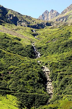 The Rhine's origins are in the Swiss Alps in the canton of Graubünden, where its two main initial tributaries are called Vorderrhein and Hinterrhein. The Vorderrhein (anterior Rhine) springs from Lake Tuma near the Oberalp Pass and passes the impressive Ruinaulta (the Swiss Grand Canyon). The Hinterrhein (posterior Rhine) starts from the Paradies glacier near the Rheinquellhorn at the southern border of Switzerland. One of the latter tributaries originates in Val di Lei in Italy. Both tributaries meet near Reichenau, still in Graubünden. From Reichenau, the Rhine flows north as the Alpenrhein passing Chur and forming the border between Liechtenstein and then Austria on the east side, and canton St. Gallen of Switzerland on the west side, then emptying into Lake Constance. Emerging from Lake Constance, flowing generally westward as the Hochrhein it passes the Rhine Falls and is joined by the Aare river which more than doubles its water discharge to an average of nearly 1,000 cubic meters per second. It forms the boundary with Germany until it turns north at the so-called Rhine knee at Basel.