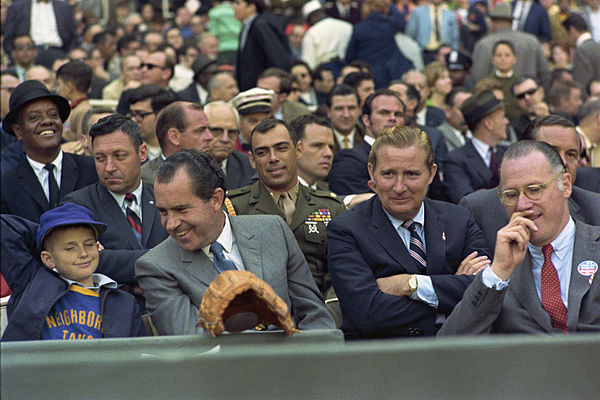 Nixon at the Washington Senators' 1969 Opening Day. Next to Nixon is Senators owner Bob Short (with arms crossed), then Baseball Commissioner Bowie Kuhn (wearing eyeglasses). Aide Jack Brennan (in uniform) sits behind Nixon.