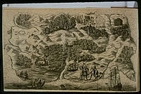 Pictorial map of Crusoe's island, aka "Island of Despair," showing incidents from the book