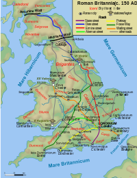 Roman province of Britannia in 125 AD, showing native tribes, cities, main roads and legions deployed
