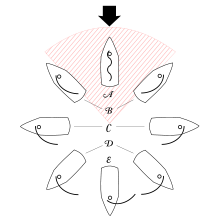 The points of sail. A. In Irons (into the wind) B. Close Hauled C. Beam Reach D. Broad Reach E. Running