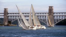 Boats heeling in front of Britannia Bridge in a round- Anglesey race 1998