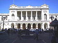 The Cathedral on the central square ( Plaza de Armas) is a sight that ranks as high as the Palacio de La Moneda, the Presidential Palace. The original building was built between 1784 and 1805, and architect Joaquín Toesca was in charge of its construction. Other buildings surrounding the Plaza de Armas are the Central Post Office Building, which was finished in 1882, and the Palacio de la Real Audiencia de Santiago, built between 1804 and 1807. It houses the Chilean National History Museum, with 12,000 objects that can be exhibited. On the southeast corner of the square stands the green cast-iron Commercial Edwards building, which was built in 1893. East of that is the colonial building of the Casa Colorada (1769), which houses the Museum of Santiago. Close by is the Municipal Theatre of Santiago, which was built in 1857 by the French architect Brunet of Edward Baines. It was badly damaged by an earthquake in 1906. Not far from the theatre is the Subercaseaux Mansion and the National Library, one of the largest libraries of South America.