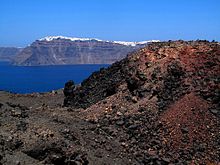 The island is the site of one of the largest volcanic eruptions in recorded history: the Minoan eruption (sometimes called the Thera eruption), which occurred some 3600 years ago at the height of the Minoan civilization. The eruption left a large caldera surrounded by volcanic ash deposits hundreds of metres deep and may have led indirectly to the collapse of the Minoan civilization on the island of Crete, 110 km (68 mi) to the south, through a gigantic tsunami. Another popular theory holds that the Thera eruption is the source of the legend of Atlantis.
