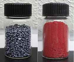 Selenium exists in several allotropes that interconvert upon heating and cooling carried out at different temperatures and rates. As prepared in chemical reactions, selenium is usually amorphous, brick-red powder. When rapidly melted, it forms the black, vitreous form, which is usually sold industrially as beads. The structure of black selenium is irregular and complex and consists of polymeric rings with up to 1000 atoms per ring. Black Se is a brittle, lustrous solid that is slightly soluble in CS2. Upon heating, it softens at 50 °C and converts to gray selenium at 180 °C; the transformation temperature is reduced by presence of halogens and amines.