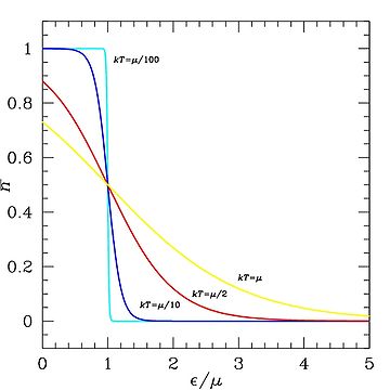 The energy distribution of the electrons determines which of the states are filled and which are empty. This distribution is described by Fermi-Dirac statistics. The distribution is characterized by the temperature of the electrons, and the Fermi energy or Fermi level. Under absolute zero conditions the Fermi energy can be thought of as the energy up to which available electron states are occupied. At higher temperatures, the Fermi energy is the energy at which the probability of a state being occupied has fallen to 0.5.