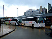 Coach services running through Sheffield are operated by National Express and to a lesser extent Megabus, part of the Stagecoach Group. National Express services call at Sheffield Interchange, Meadowhall Interchange and Meadowhead Bus Stop. Megabus services only call at Meadowhall. National Express services 564, 560, 350, 320, 310 and 240 call at Sheffield, as do others on a less frequent basis. The 560/564 service is a direct connection to London Victoria Coach Station via Chesterfield and Milton Keynes, operating 12 times a day in both directions. The 350 and 240 services connect Sheffield to Manchester Airport and Heathrow & Gatwick Airports respectively. Two megabus services, the M12 and M20, call at Sheffield en route to London from Newcastle upon Tyne and Inverness respectively.