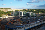 The start of the Sheffield Parkway, as viewed from Park Square, where it meets the City Centre. The road, in the centre, is six lanes wide and leads towards the Parkway Edge development (left-centre) where the road meets the Inner Ring Road. To the left is the Sheffield Supertram viaduct and beyond that a new apartment complex.