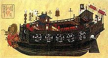 At this time, ships were developing in Asia in much the same way as Europe. Japan used defensive naval techniques in the Mongol invasions of Japan in 1281. It is likely that the Mongols of the time took advantage of both European and Asian shipbuilding techniques. During the 15th century, China's Ming Dynasty assembled one of the largest and most powerful naval fleet in the world for the diplomatic and power projection voyages of Zheng He. Elsewhere in Japan in the 15th century, one of the world's first iron-clads, "Tekkōsen" ( 鉄甲船), literally meaning "iron ships", was also developed. In Japan, during the Sengoku era from the fifteenth to 17th century, the great struggle for feudal supremacy was fought, in part, by coastal fleets of several hundred boats, including the atakebune.