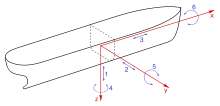 Vessels move along the three axes: 1. heave, 2. sway, 3. surge, 4. yaw, 5. pitch, 6. roll