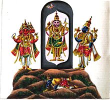 Syncretic forces produced stories in which the two deities were shown in cooperative relationships and combined forms. Harihara is the name of a combined deity form of both Vishnu ( Hari) and Shiva (Hara). This dual form, which is also called Harirudra, is mentioned in the Mahabharata. An example of a collaboration story is one given to explain Shiva's epithet Mahābaleśvara, "lord of great strength" (Maha = "great", Bala = "strength", Īśvara = "lord"). This name refers to a story in which Rāvaṇa was given a linga as a boon by Shiva on the condition that he carry it always. During his travels, he stopped near the present Gokarna, India in Karnataka to purify himself and asked Ganesha, a son of Parvathi in the guise of a young Brahmin, to hold the linga for him, but after some time, Ganesha put it down on the ground and vanished. When Ravana returned, he could not move the linga, and it is said to remain there ever since.