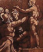 The subjects are the more gruesome or shameful of Biblical episodes, the only exception seeming to be that of Elijah being swept up to Heaven in a Chariot of Fire, leaving his mantel to fall on Elisha. However, Elijah's role as a prophet was one marked by accusation and warnings to repent, and the purpose of his translation into Heaven was traditionally seen as so that he might stand before God to condemn Israel for its sins. In four of the five most highly finished "medallions" the space is crowded with figures in violent action, similar to Michelangelo's cartoon for the Battle of Cascina.