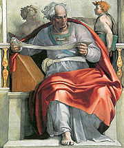 In Vasari's description of the Prophets and Sibyls he is particularly high in his praise of the portrayal of Isaiah: "Anyone who studies this figure, copied so faithfully from nature, the true mother of the art of painting, will find a beautifully composed work capable of teaching in full measure all the precepts to be followed by a good painter.”