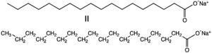 Two equivalent images of the chemical structure of sodium stearate, a typical soap.