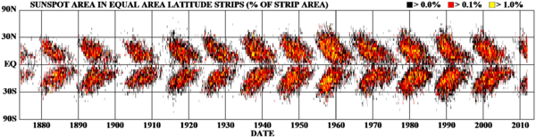 Following the numbering scheme established by Wolf, the 1755–1766 cycle is traditionally numbered "1". The period between 1645 and 1715, a time during which very few sunspots were observed, is a real feature, as opposed to an artifact due to missing data. This epoch is now known as the Maunder minimum, after Edward Walter Maunder, who extensively researched this peculiar event, first noted by Gustav Spörer. In the second half of the nineteenth century it was also noted (independently) by Richard Carrington and by Spörer that as the cycle progresses, sunspots appear first at mid-latitudes, and then closer and closer to the equator until solar minimum is reached. This pattern is best visualized in the form of the so-called butterfly diagram, first constructed by the husband-wife team of E. Walter and Annie Maunder in the early twentieth century (see graph below). Images of the Sun are divided into latitudinal strips, and the monthly-averaged fractional surface of sunspots calculated. This is plotted vertically as a colour-coded bar, and the process is repeated month after month to produce this time-latitude diagram.