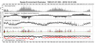 Emission from the Sun at centimetric (radio) wavelength is due primarily to coronal plasma trapped in the magnetic fields overlying active regions. The F10.7 index is a measure of the solar radio flux per unit frequency at a wavelength of 10.7 cm, near the peak of the observed solar radio emission. F10.7 is often expressed in SFU or solar flux units (1 SFU = 10-22 W m-2 Hz-1). It represents a measure of diffuse, nonradiative heating of the coronal plasma trapped by magnetic fields over active regions. It is an excellent indicator of overall solar activity levels and correlates well with solar UV emissions.
