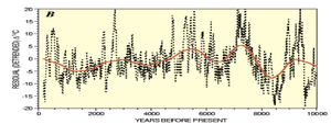 • A simple model based on emulating harmonics by multiplying the basic 11-year cycle by powers of 2 produced results similar to Holocene behaviour. Extrapolation suggests a gradual cooling during the next few centuries with intermittent minor warmups and a return to near Little Ice Age conditions within the next 500 years. This cool period then may be followed approximately 1,500 years from now by a return to altithermal conditions similar to the previous Holocene Maximum.