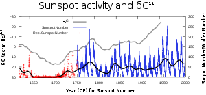 Sunspot record (blue) with 14C (inverted). There is approximately a 60 year delay between sunspot levels and radiocarbon changes.