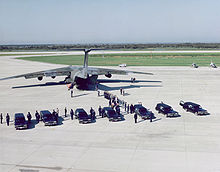 The remains of the Challenger crew are transferred to a C-141 at the NASA KSC Shuttle Landing Facility, bound for Dover Air Force Base, Delaware.